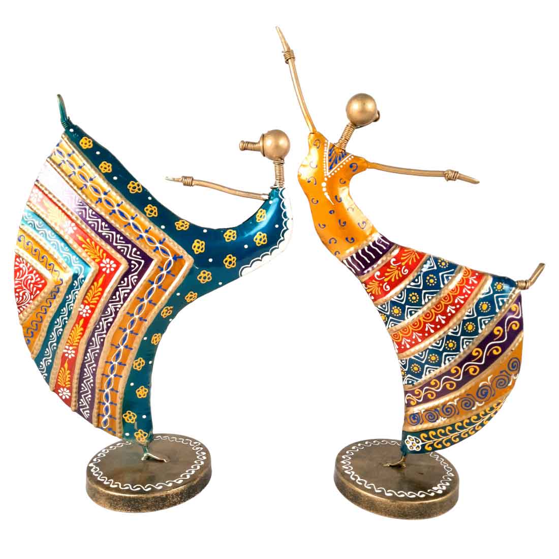 The product shown is a set of two metal dancing doll showpieces. The dolls are handcrafted by artisans in Rajasthan and are designed for home and office decor.