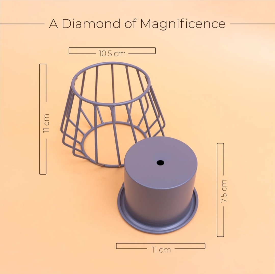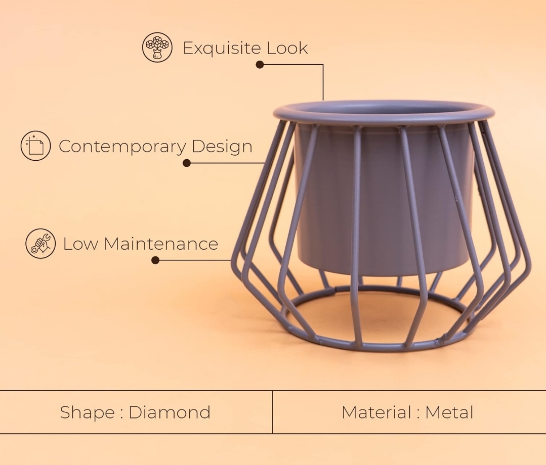 Shape of the pot: Cylindrical | Shape of the stand: Diamond | Pot and stand colour: grey | Material: Metal | Packaging Detail: 1 Metal Pot With Stand