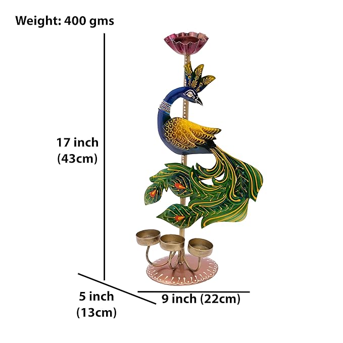 Bring the allure of traditional Indian craftsmanship to your home with our handcrafted iron peacock tealight candle holder. This striking tabletop showpiece features the majestic peacock, intricately hand-painted in the rich, vibrant hues of Rajasthani art, known for its exquisite beauty and cultural significance.