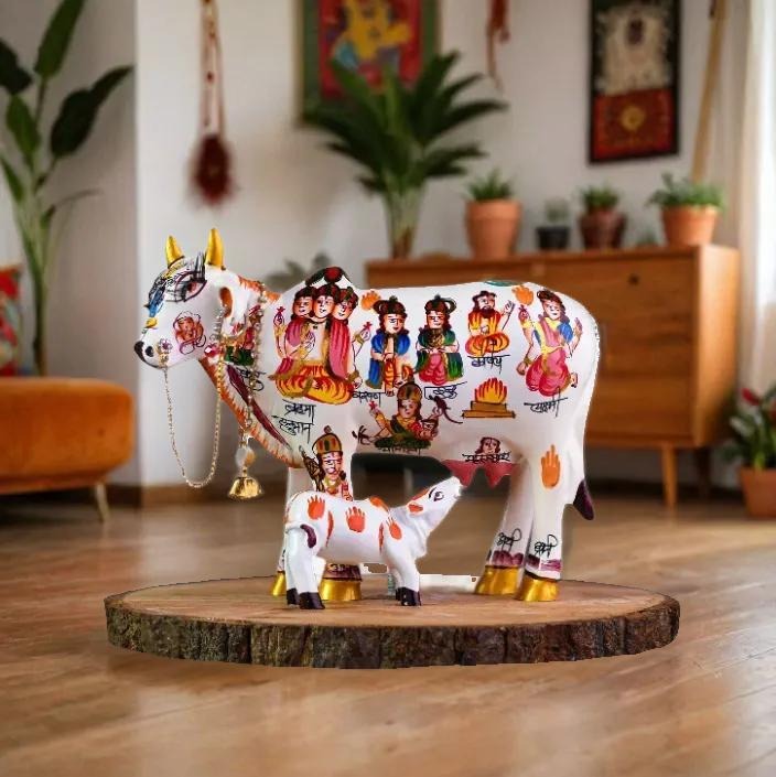 The image displays an idol of the Kamadhenu cow and calf, which is a significant figure in Hinduism.