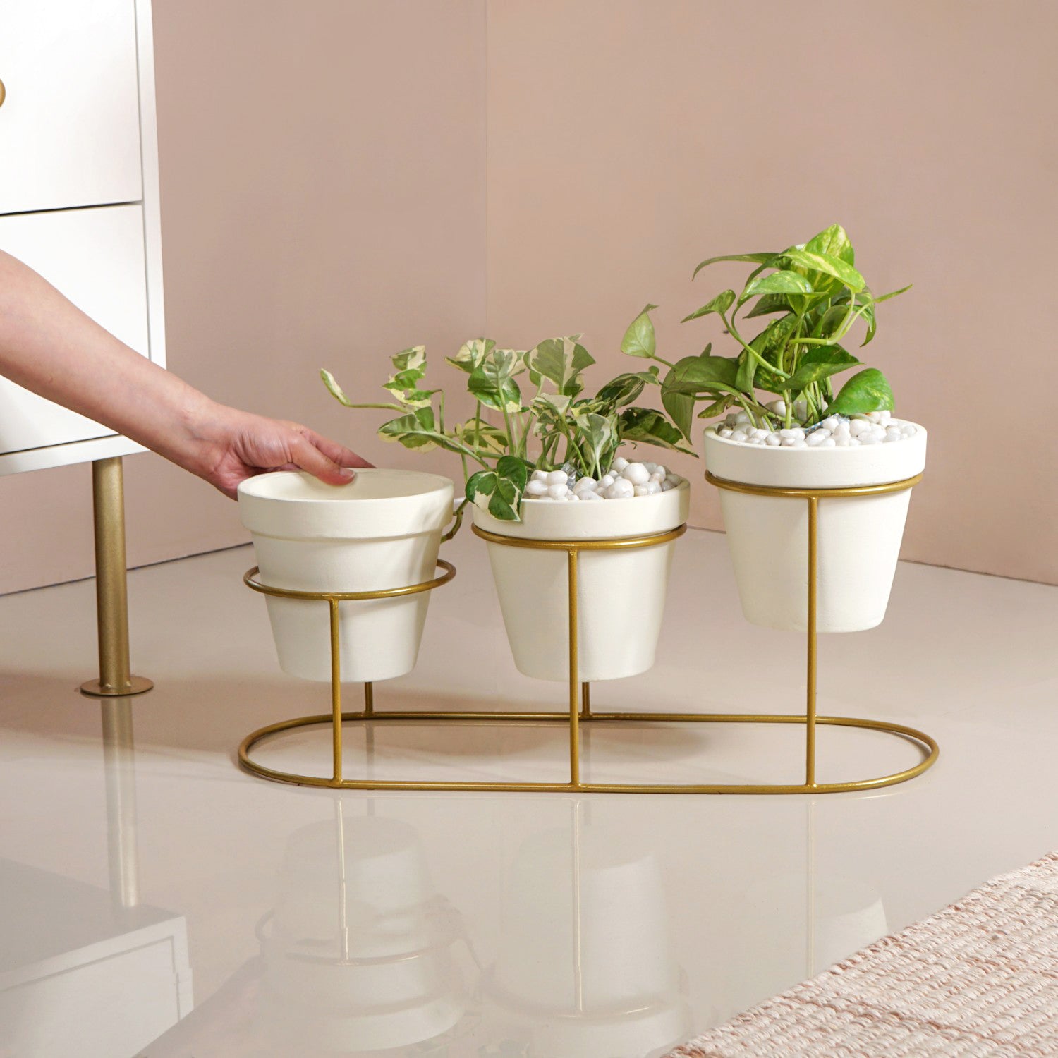 The stand and pots are designed for indoor use, suitable for showcasing houseplants, succulents, or decorative items.