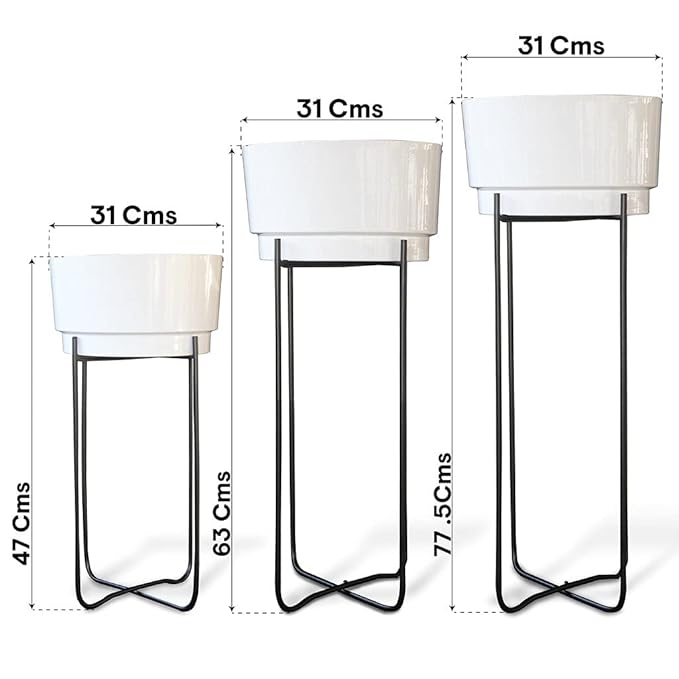 The magnificent house-floor standing planter set will give your indoor plants a real lift. The height of this stand set allows for the drama of cascading plants to spill over the sides. A gorgeous round shape creates plenty of room for a variety of houseplants. The deep circular shape of the containers allows pots to fit inside easily. The lightweight metal construction and sturdy build make them easy to move around. The metal plant stand comes flat and just needs to open it. Simply stand it up and put the planter pots on. It is also easy to move it to a different spot or different place. The 3 pcs standing planter pots are coming with metal plant stands. No assembly needed. Just take out the metal plant stand and put the metal planters on it. Use them in a bathroom, a bedroom, or a covered porch or patio for a beautiful display.